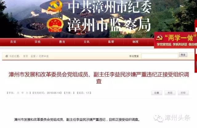 漳州頭條從中共漳州市紀委、漳州市監(jiān)察局網站獲悉,州市紀委今天早上剛剛權威發(fā)布,漳州市發(fā)展和改革委員會黨組成員、副主任李益民涉嫌嚴重違紀,目前正接受組織調查。