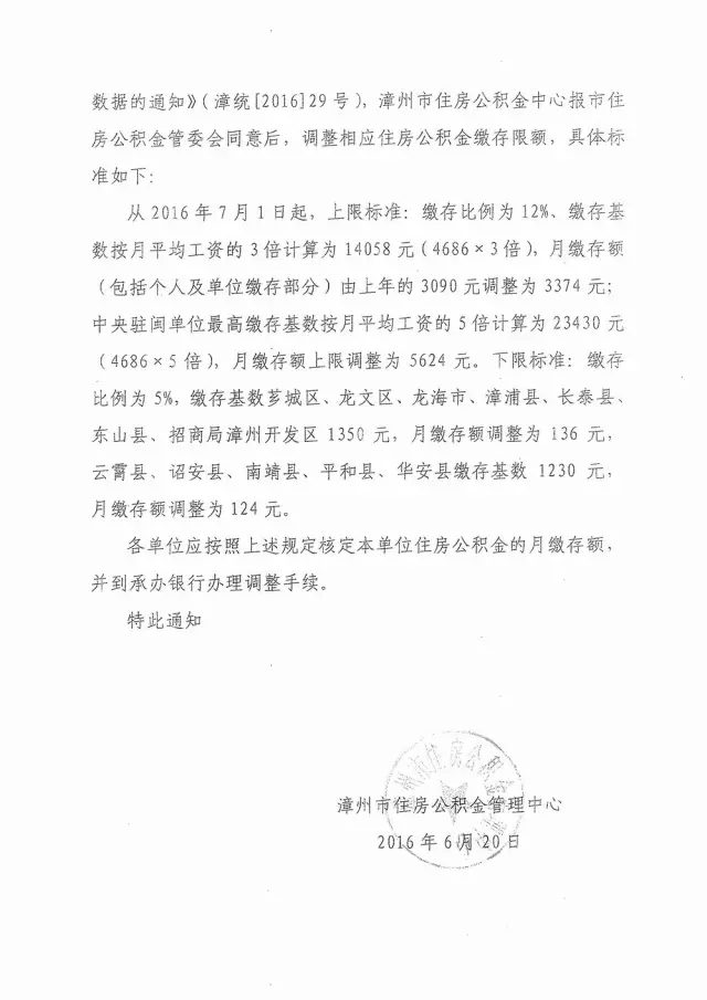 下限標(biāo)準(zhǔn):繳存比例為5%,繳存基數(shù)薌城區(qū)、龍文區(qū)、龍海市、漳浦縣、長泰縣、東山縣、招商局漳州開發(fā)區(qū)1350元,月繳存額調(diào)整為136元。云霄縣、詔安縣、南靖縣、平和縣、華安縣繳存基數(shù)1230元,月繳存額調(diào)整為124元。