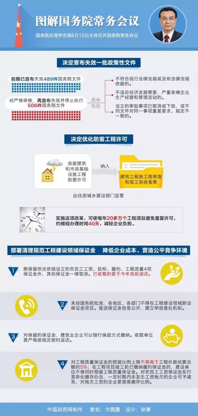 當(dāng)天會(huì)議部署清理規(guī)范工程建設(shè)領(lǐng)域保證金,降低企業(yè)成本、營(yíng)造公平競(jìng)爭(zhēng)環(huán)境。有關(guān)部門負(fù)責(zé)人在發(fā)言中說,目前工程建設(shè)領(lǐng)域保證金不僅收取名目繁多,也存在占用資金數(shù)額巨大、返還時(shí)間較長(zhǎng)等問題。